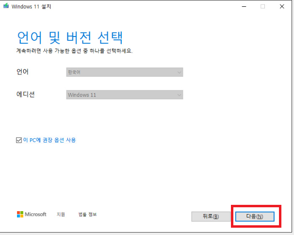 언어는 한국어 및 다른 나라도 선택할 수 있고 에디션은 Windows 11로 고정되어 있습니다.