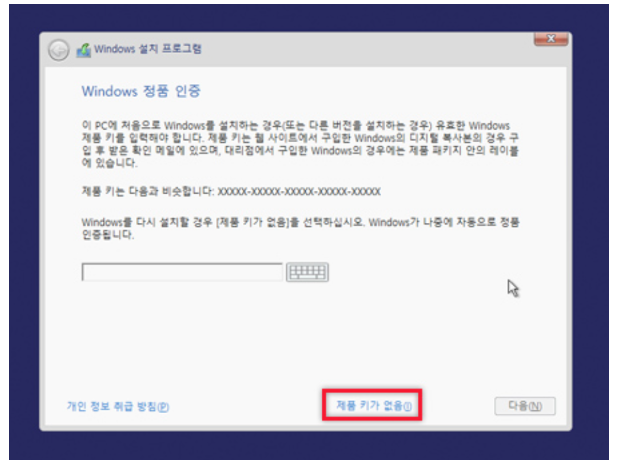 3.윈도우 정품을 구입하셨다면 제품키를 입력하고 다음을 누르면 되고 없으시다면 제품 키가 없음 을 클릭합니다. 현 상태에서 제품키를 입력하지 않아도 윈도우 설정에서 넣어주면 되므로 크게 신경쓰지 않으셔도 됩니다.