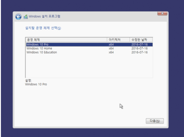 4.설치할 윈도우 버전을 선택합니다. Pro 로 설치해주세요.
