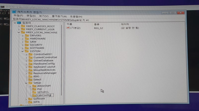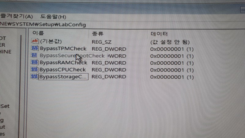 값을 모두 바꿨으면, 레지스트리 편집기 창을 닫은 후 좌측 상단에 있는 뒤로가기 버튼을 누른 뒤에 윈도우11을 설치해주세요.