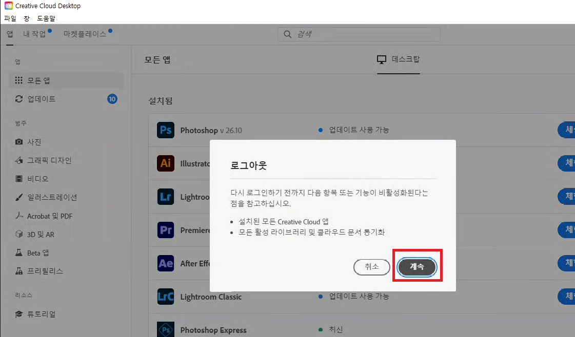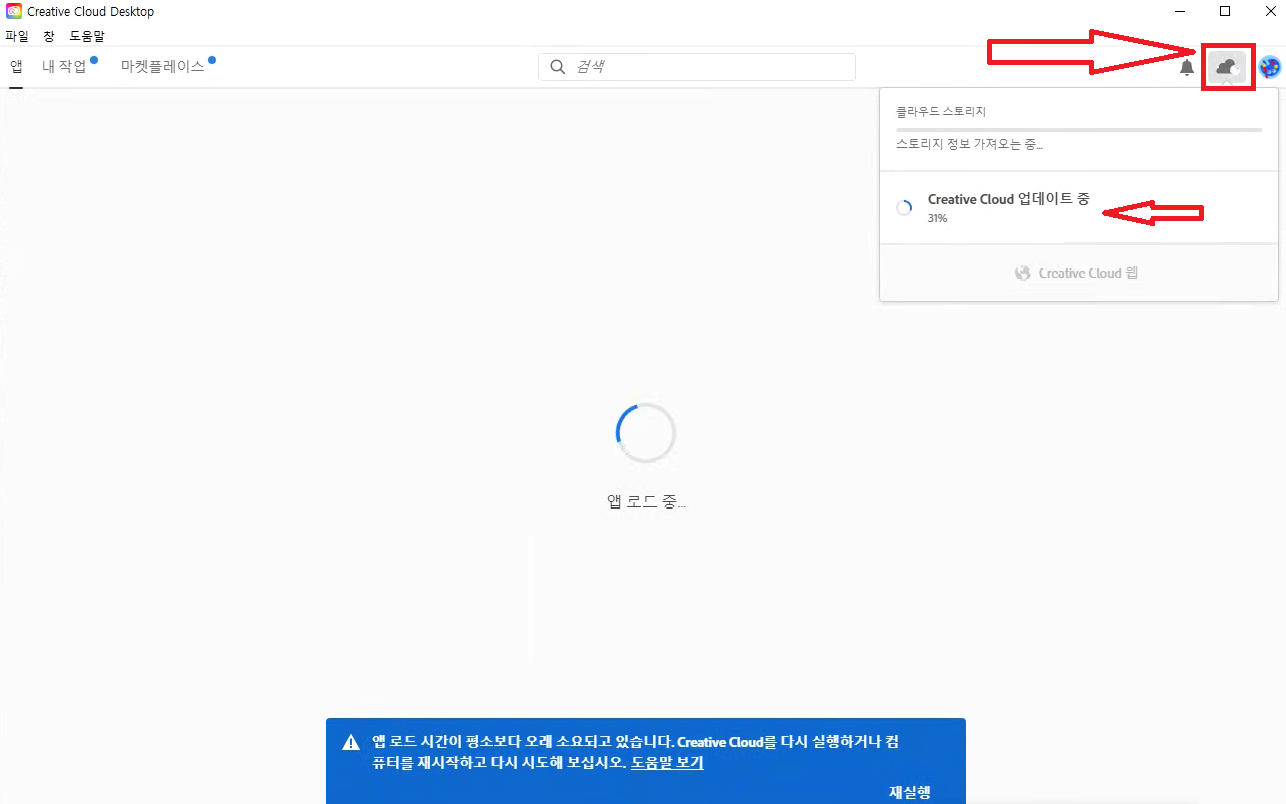 5. 한칸 왼쪽 구름모양 클릭하여 , Creative Cloud 업데이트 100%까지 기다려 주세요.